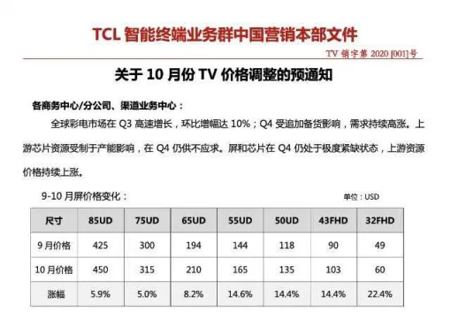 以TCL為例,在去年9月中旬,TCL就啟動(dòng)了調(diào)價(jià)措施,其32英寸到75英寸,上漲200-2000元不等。不到一個(gè)月時(shí)間便再次調(diào)漲價(jià)格,這也充分反映了上游芯屏資源緊缺,面板價(jià)格飛漲的現(xiàn)狀。