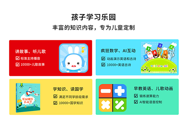 可以講故事、聽兒歌、學(xué)知識(shí)、讀國(guó)學(xué)、瘋狂數(shù)學(xué)、AI互動(dòng)、早教英語(yǔ)、兒歌動(dòng)畫等;